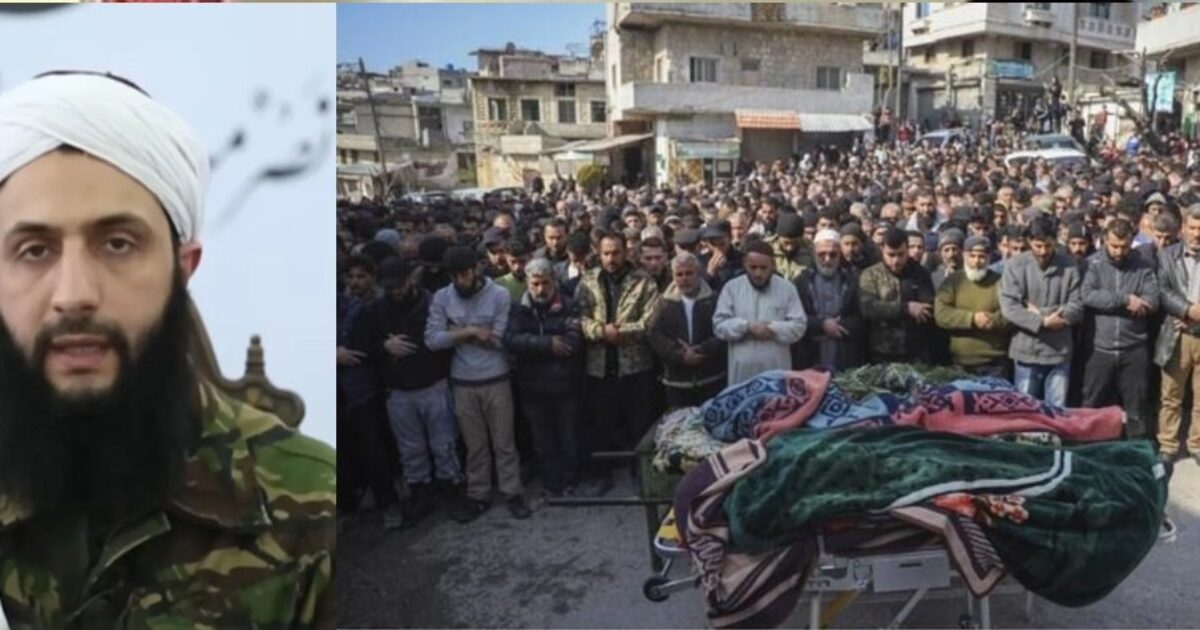 Composite image of Syrian interim president Ahmed al-Sharaa (al-Julani), a former al-Qaeda leader. On the right, mourners gathered for victims of the government-backed massacre of Syrian Alawites in March 2025.