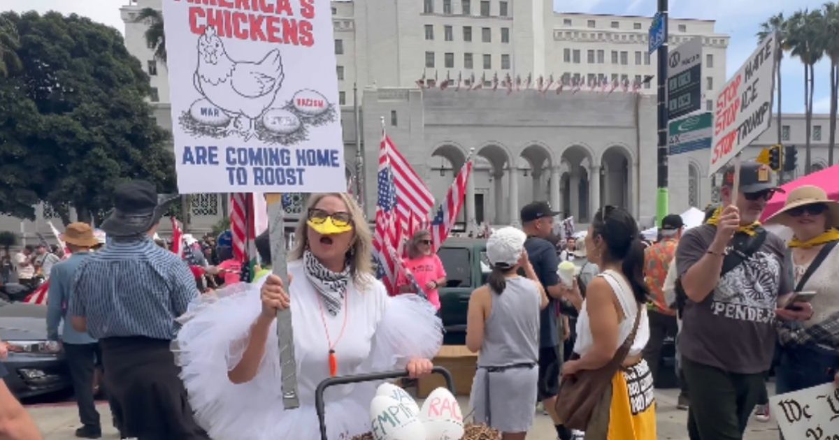 An unhinged liberal woman dressed in a full chicken costume clucked loudly and declared “America’s chickens are coming home to roost” during Saturday’s “No Kings” protest in Los Angeles against President Trump.