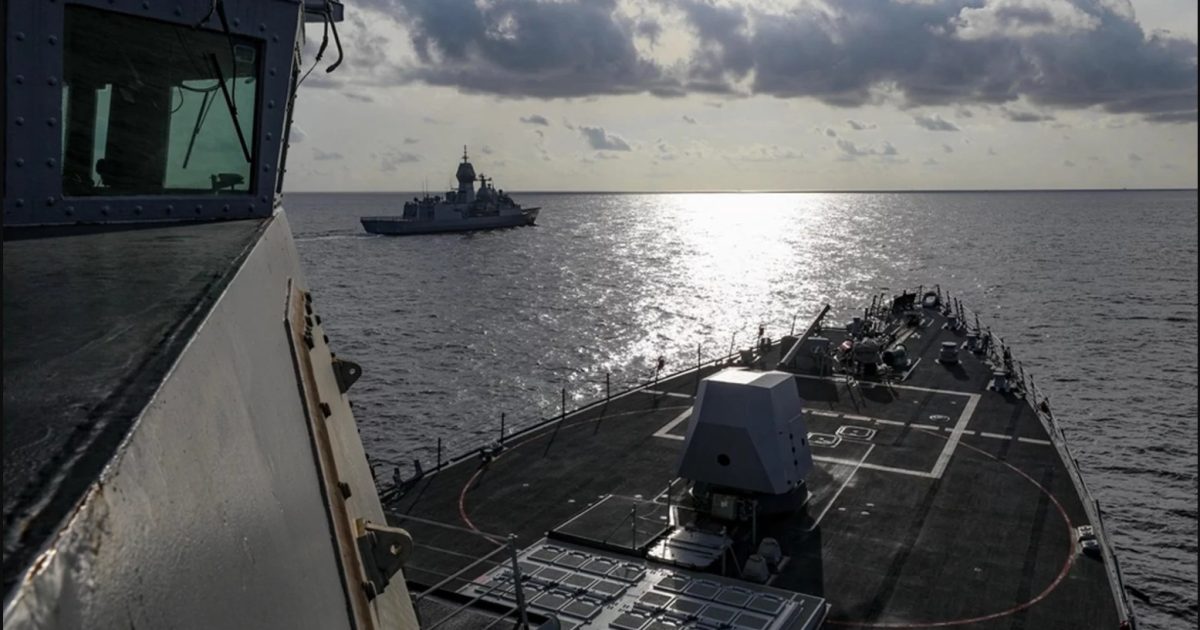 The U.S. Navy destroyer USS Dewey and the Australian destroyer HMAS Stuart patrol the Strait of Malacca. (Photo courtesy of the U.S. Department of War)